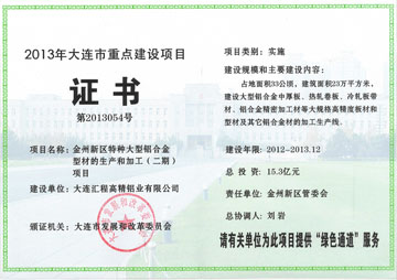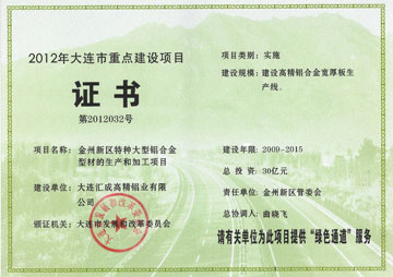 匯程鋁業(yè)于2012年成為遼寧省重點項目并榮獲大連市頒發(fā)的2012年大連市重點項目證書;2013年榮獲大連市發(fā)展和改革委員會頒發(fā)的2013年大連市重點建設項目證書及2013年獲得政府頒發(fā)的首批最佳入駐企業(yè)及年度特殊貢獻企業(yè)榮譽牌匾。