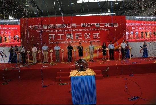 在我司“一期投產暨二期開工剪彩儀式”典禮上,由總經理韓德光主持,董事長楊曉光致歡迎詞,李莉主任代表市領導講話。由主席臺十位貴賓為一期投產暨二期項目開工剪彩,隨后,由常務副市長曹愛華和匯程資本董事會主席陳維平同時觸摸啟動球,三條生產線上的設備同時運轉起來,二期工地現場也頓時鞭炮齊鳴、彩煙騰空、機聲隆隆......標志著匯程鋁業一期已進入正式投產,二期全面開始建設。