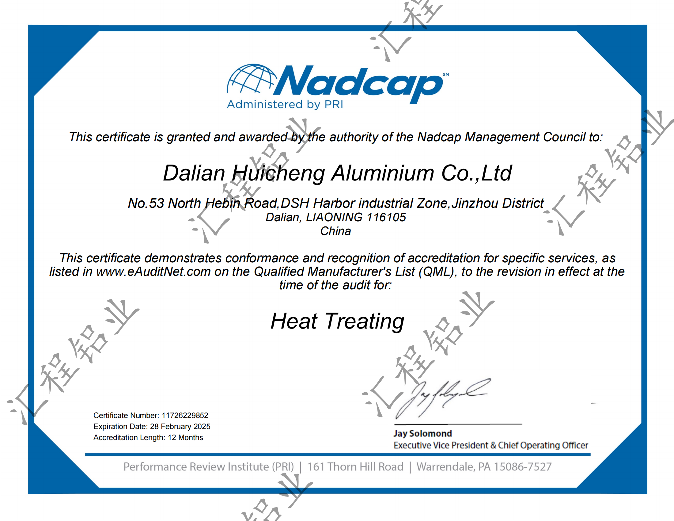 近日,大連匯程鋁業有限公司順利通過了Nadcap熱處理認證并取得證書。在認證團隊的充分準備下,小組成員團結協作,高效配合,順利通過了為期五天的現場審核,為公司在航空航天領域的進一步發展夯實了基礎。Nadcap 熱處理認證的通過,展現了匯程鋁業過硬的工藝技術實力、良好的設備運行保障能力和高效的協同管理能力。