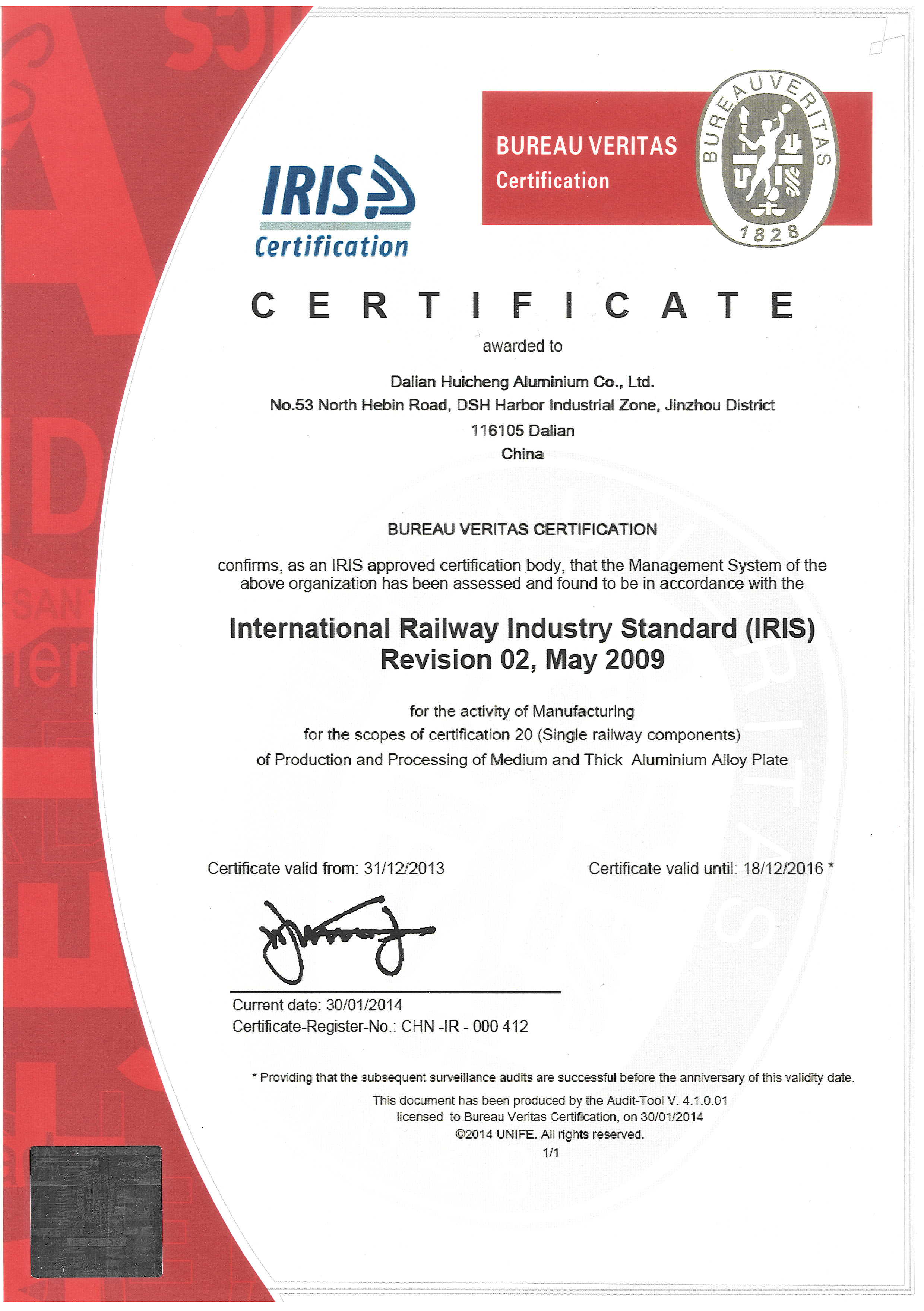 2014-02-252014年2月25日,大連匯程鋁業有限公司獲得了法國BV認證公司頒發的IRIS質量管理體系認證證書。