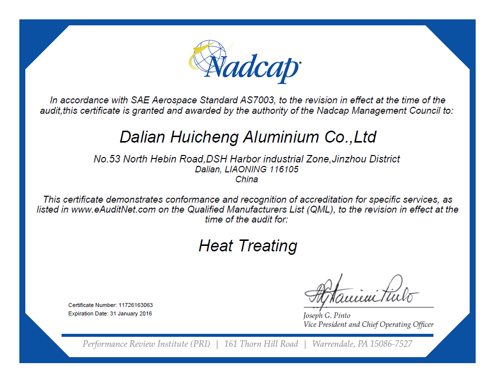 2014-12-192014年12月19日,大連匯程鋁業有限公司獲得了美國質量評審協會頒發的Nadcap認證證書。