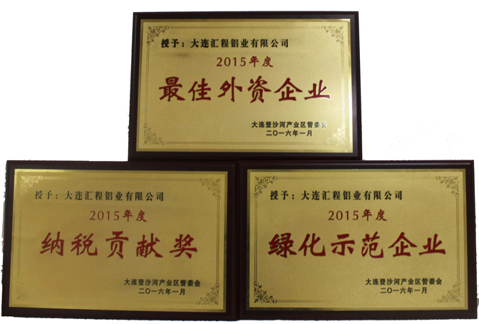 2016年1月15日,“關于表彰2015年度先進單位”的表彰大會,在大連登沙河產業區管委會隆重召開,大連匯程鋁業有限公司榮獲了 “納稅貢獻獎”“最佳外資企業”“綠化示范企業”三個榮譽稱號。